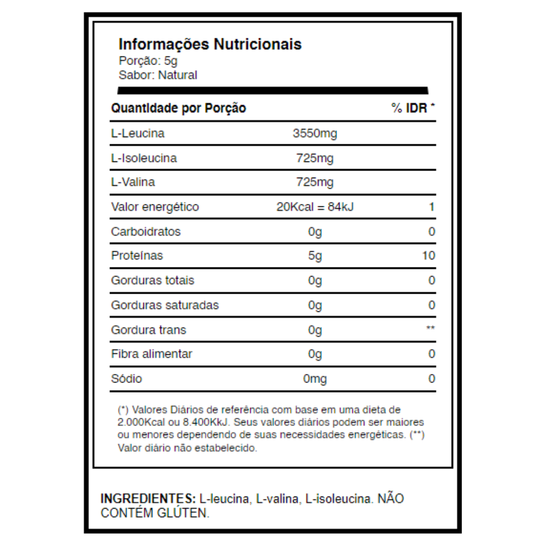 - Leucina, Isoleucina e Valina: Fórmula balanceada com a proporção 5:1:1, cientificamente comprovada para maximizar os benefícios dos BCAAs.