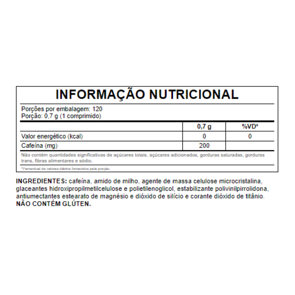- Cafeína Pura: Cada comprimido contém 200mg de cafeína de alta qualidade, proporcionando um impulso confiável de energia sempre que você precisar.